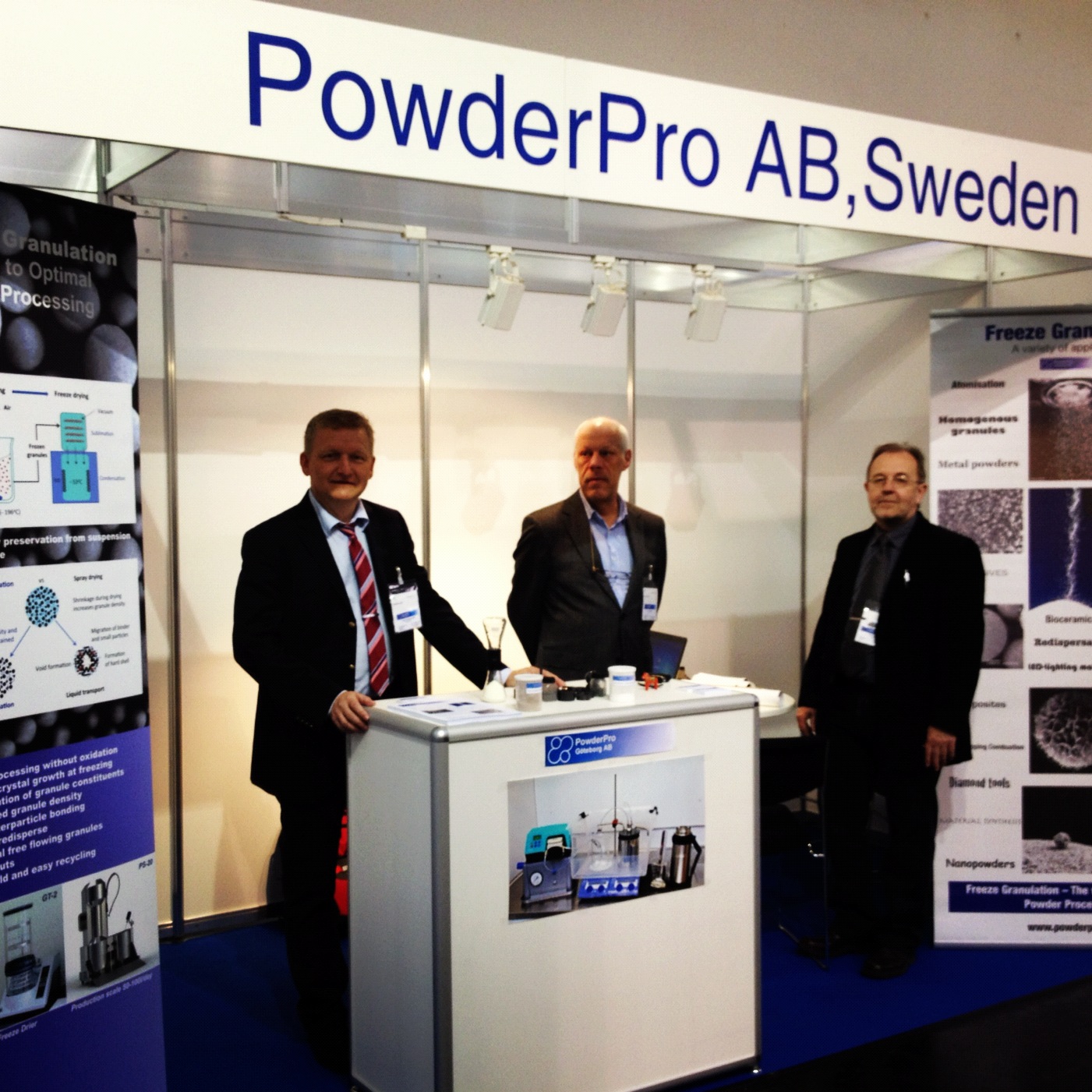 Welcome to our stand B6:507 at CERAMITEC 2012 Today we opened our stand at CERAMITEC 2012 in München. Many interesting discussions and meetings with both new and old customers how Freeze Granulation can improve the granule homogeneity and final properties of the component. Welcome! PowderPro stand at CERAMITEC 2012